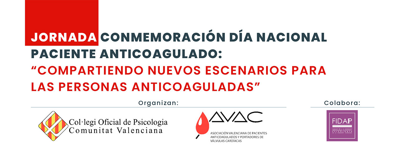 El próximo 18 de noviembre de 2025, el Col·legi Oficial de Psicologia de la Comunitat Valenciana (COPCV) conjuntamente con la Asociación Valenciana de Pacientes Anticoagulados y Portadores de Válvulas Cardíacas (AVAC) y con la colaboración de la Fundación para la Investigación, Desarrollo y Aplicación de la Psicología de la Comunidad Valenciana (FIDAP), organizarán la jornada “Compartiendo nuevos escenarios para las personas anticoaguladas”.