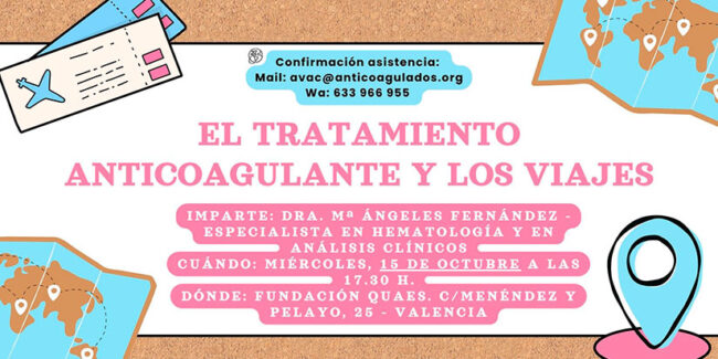 EL TRATAMIENTO ANTICOAGULANTE Y LOS VIAJES Monográfico El tratamiento anticoagulante y los viajes impartido por la Dra. Mª Ángeles Fernández, especialista en hamotogía y en análisis clínicas el miércoles 15 de octubre a las 17:30 h. en la Fundación Quaes – C/ Menéndez y Pelayo, 25 – Valencia